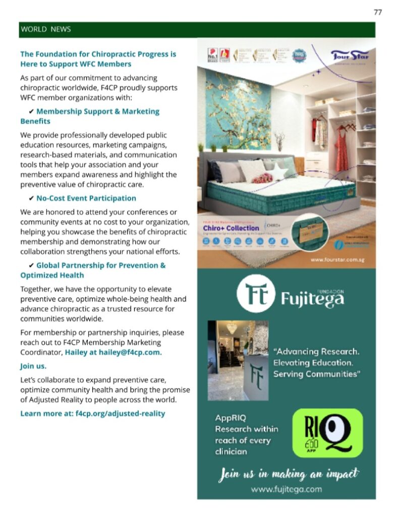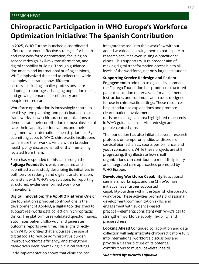 Es un honor compartir que en el número de enero de 2026 de la revista oficial de la World Federation of Chiropractic (WFC) se ha publicado un artículo sobre nuestro trabajo, destacando el impacto de la Fundación Fujitega en el desarrollo de la investigación y la visibilidad de la quiropráctica.